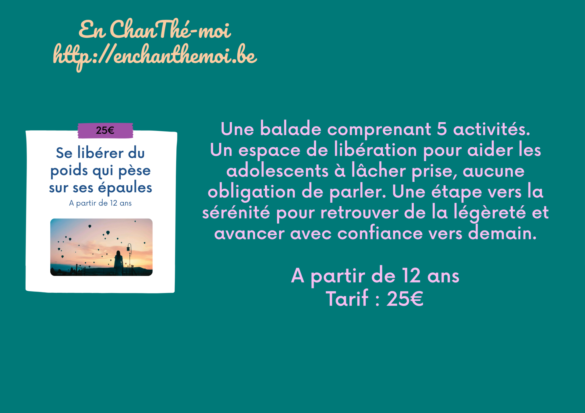 Cette activité propose de prendre un moment pour se recentrer tout en allégeant son sac à dos, tant sur le plan physique que mental. Cette balade permet de faire une pause, de se libérer de la surcharge qui pèse sur les épaules et de se reconnecter avec soi-même. N'hésitez pas à demander un rendez-vous.