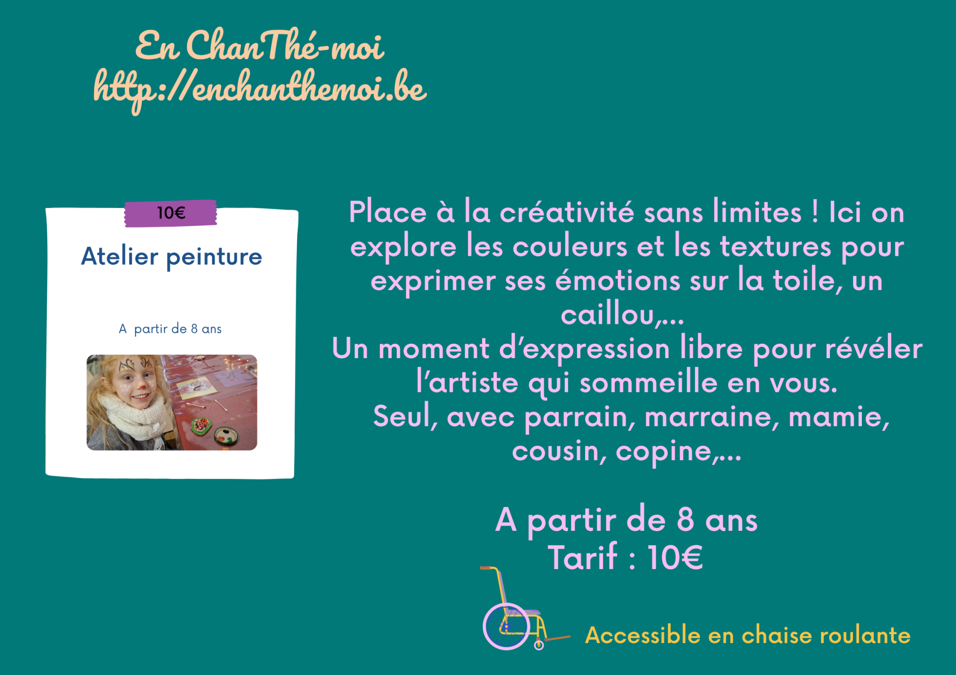 Exprimez votre créativité et laissez parler votre imagination à travers nos ateliers de peinture. Que vous soyez débutant ou passionné, dans une ambiance conviviale et inspirante, offrez-vous un moment pour relâcher la pression, développer votre sens artistique et créer des œuvres uniques. Rejoignez-nous pour peindre un monde à votre image !